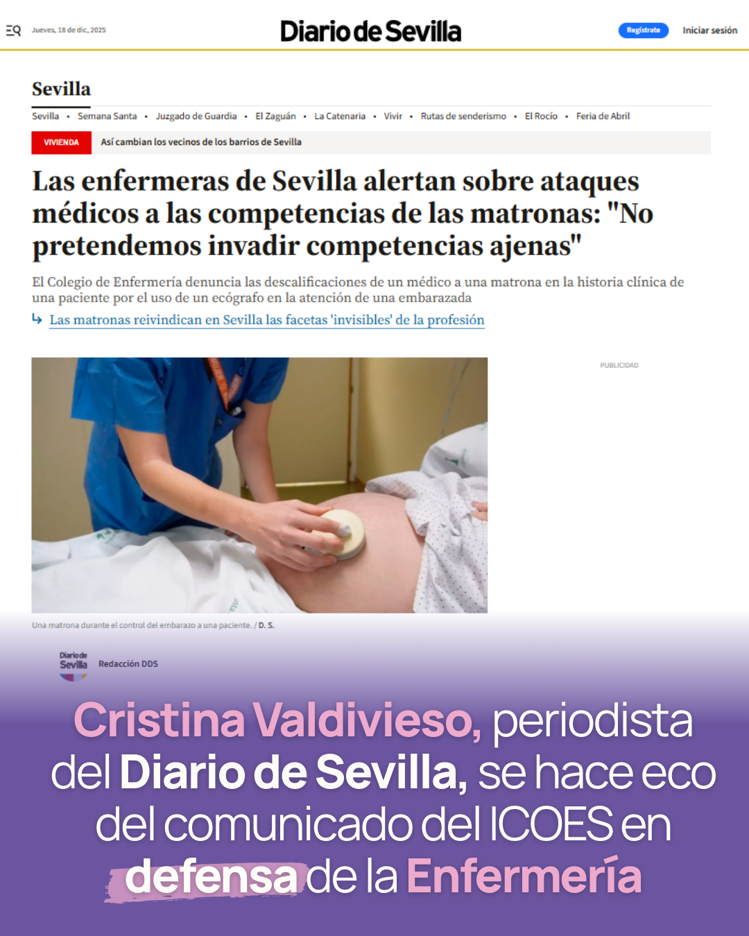 El ICOES muestra su repulsa ante los ataques a las matronas y defensa de la reclasificación profesional de la Enfermería 18 de diciembre, 2025 Diario de Sevilla se hace eco del comunicado del ICOES en defensa de la profesión Enfermera "El Colegio de Enfermería denuncia las descalificaciones de un médico a una matrona en la …
