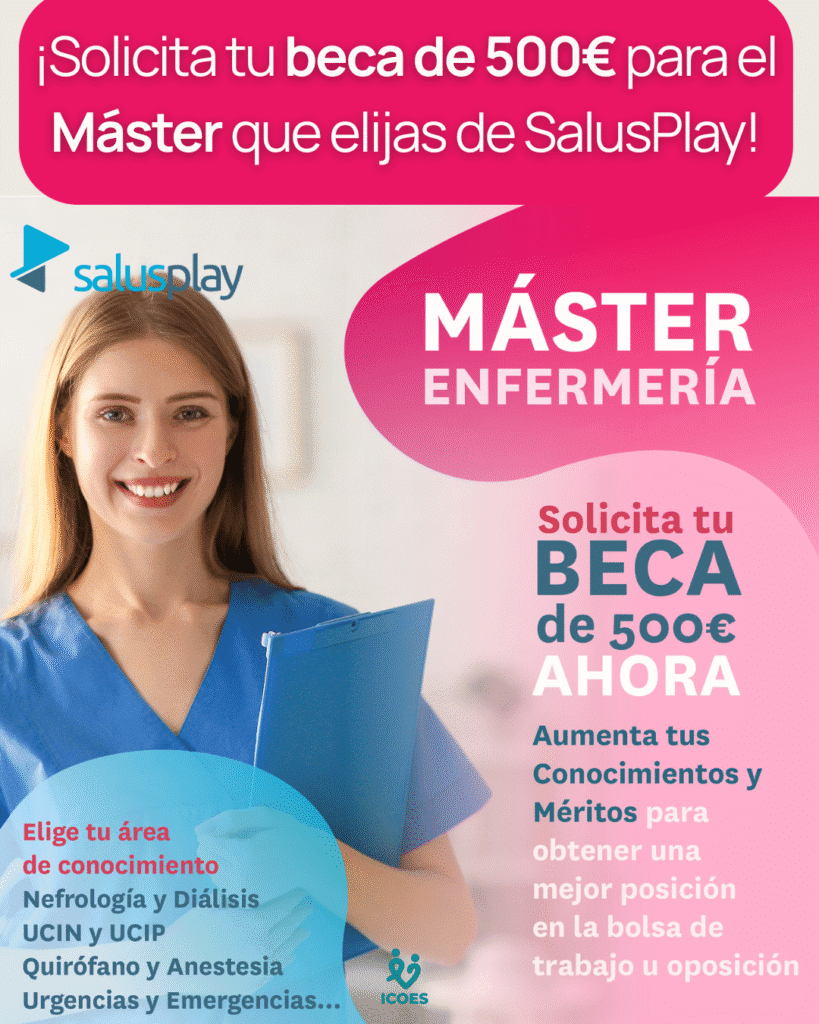Al ser miembro del Colegio de Enfermería, puedes reservar una de las 10 becas disponibles de 500€ para realizar uno de los Másteres Online de SalusPlay que comienzan el 1 de marzo de 2026