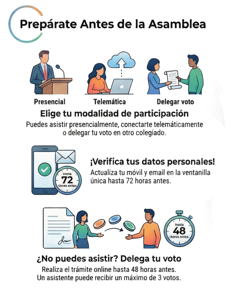 Los detalles de la convocatoria, asuntos a tratar, documentación anexa y la normativa para la votación están a tu disposición en la Ventanilla Única del ICOES en el apartado Transparencia/Asamblea y en el tablón de anuncio de la Sede