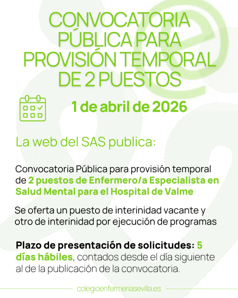Inicio Sala de prensa Convocatoria Pública para provisión temporal de 2 puestos de Enfermero/a Especialista en Salud Mental para el Hospital de Valme