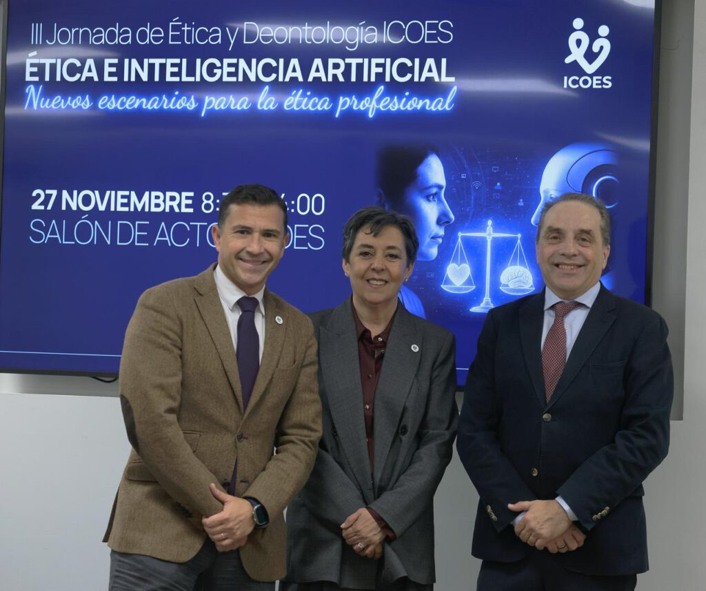 La inauguración de la Jornada ICOES Ética e Inteligencia Artificial corre a cargo de Víctor Bohórquez, presidente del ICOES; Yolanda Izquierdo, vicepresidenta en el ICOES; y de José Antonio Suffo, presidente de la Comisión de Ética y Deontología en el ICOES.