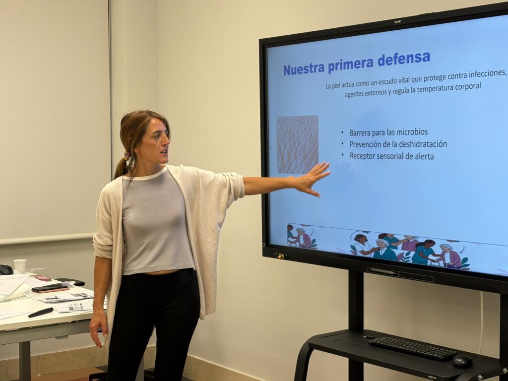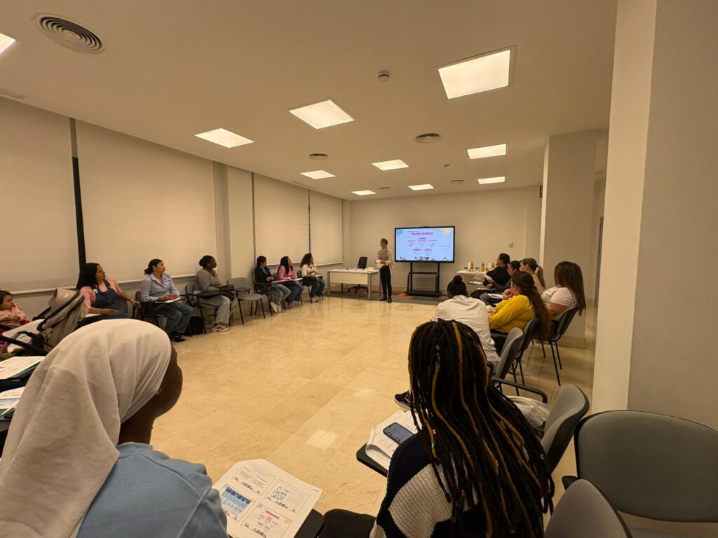 Entre otras materias, Raquel Contreras, vocal en el ICOES, ha mostrado técnicas de higiene e incontinencia, manejo de sondas vesicales, abordaje básico de heridas, prevención y abordaje de úlceras por presión y cambios posturales entre otros cuidados clave para ofrecer una asistencia de calidad a personas en situación de dependencia. La sesión ha contado con 21 alumnas de procedencia muy diversa (Colombia, Gambia, El Salvador, Argelia, etcétera), muchas de ellas acompañadas por hijos pequeños y con un nivel educativo diverso, desde cuidadoras hasta psicólogas.
