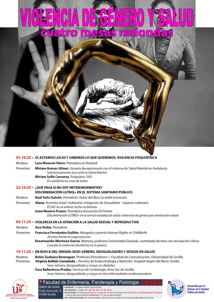 El próximo miércoles 5 de noviembre, a las 19:00 horas, el Salón de Actos de la Facultad de Enfermería, Fisioterapia y Podología de la Universidad de Sevilla acogerá la tercera mesa redonda del ciclo “Violencia de género y Salud”, una iniciativa organizada con la financiación de la Unidad para la Igualdad de esta universidad.