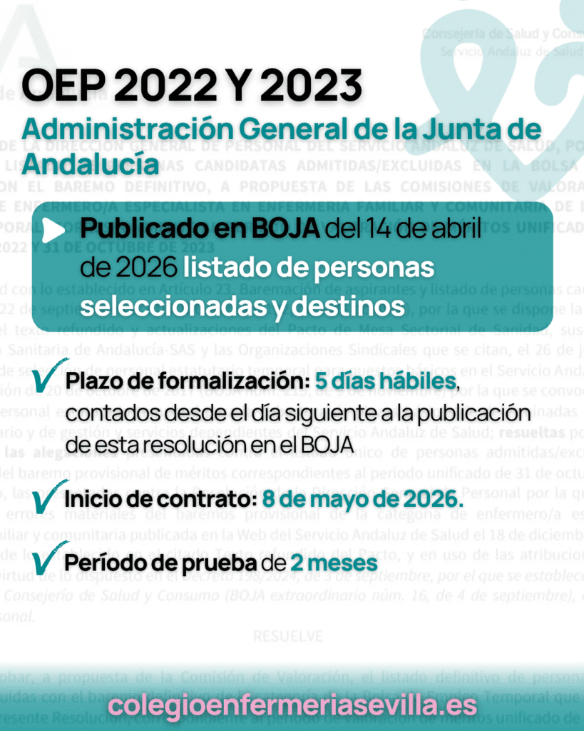 La Dirección General de Recursos Humanos y Función Pública ha aprobado la relación definitiva de personas seleccionadas y los destinos adjudicados para el acceso a la condición de personal laboral fijo en la categoría de Diplomado/a en Enfermería (Grupo 002 – Titulado Grado Medio), correspondientes a las Ofertas de Empleo Público de los años 2022 y 2023.