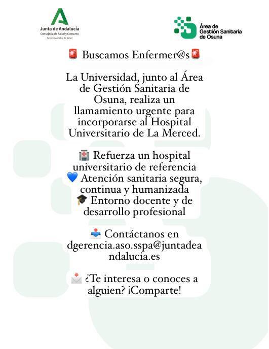 El Área de Gestión Sanitaria de Osuna ha realiza un llamamiento urgente de candidatos para incorporarse al Hospital Universitario La Merced.