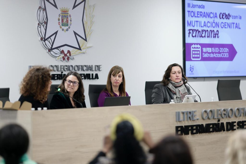 La inauguración de la III Jornada Tolerancia Cero con la Mutilación Genital Femenina cuenta con Carmen Mejías, presidenta de la Asociación Andaluza de Matronas (AAM); María Victoria Llamas, enfermera y técnica en la Dirección General de Políticas Migratorias de la Consejería de Inclusión Social, Juventud, Familias e Igualdad; y Mercedes Soriano, coordinadora provincial del IAM en Sevilla.