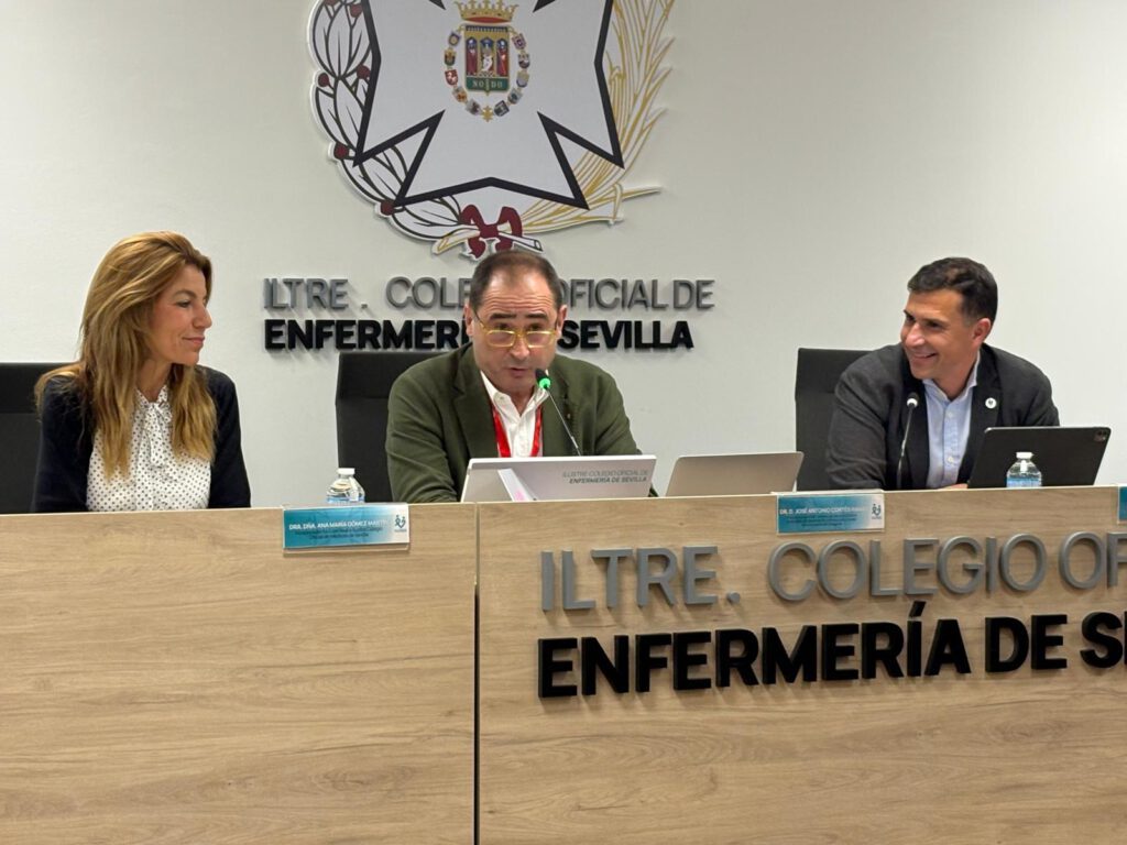 El presidente de la Asociación de Sanitarios en Bomberos de España (ASBA), José Antonio Cortés, clausura en el ICOES su encuentro nacional de Sanitarios en Bomberos, junto a Ana María Gómez, vicepresidenta del Colegio de Médicos de Sevilla y a Víctor Bohórquez, presidente del ICOES