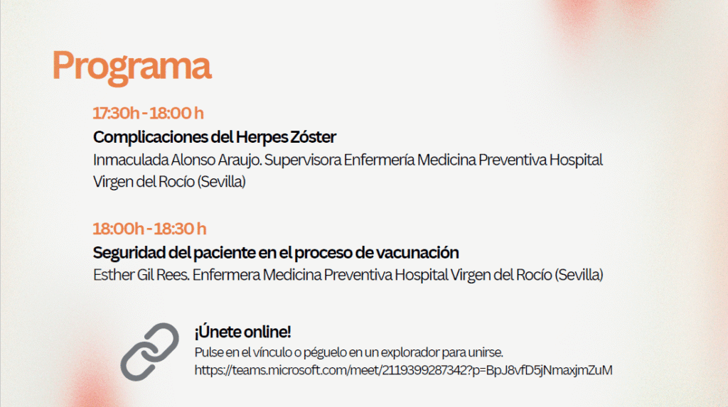 El próximo martes 4 de noviembre, de 17:30 a 18:30, se llevará a cabo una reunión científica online dirigida a profesionales de la salud, centrada en el papel fundamental de las enfermeras en la prevención del Herpes Zóster. Este evento, organizado en un entorno especializado, busca informar y capacitar sobre las complicaciones de esta enfermedad y la seguridad del paciente en el proceso de vacunación.
