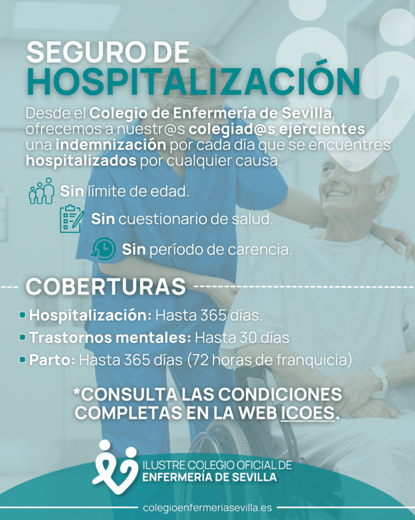 Queremos cuidar de ti cuando más lo necesitas, por ello desde el Colegio de Enfermería de Sevilla ofrecemos a todos nuestros colegiados ejercientes, una indemnización por cada día que se encuentren hospitalizado por cualquier causa (la hospitalización por parto cuenta con 72 horas de franquicia)